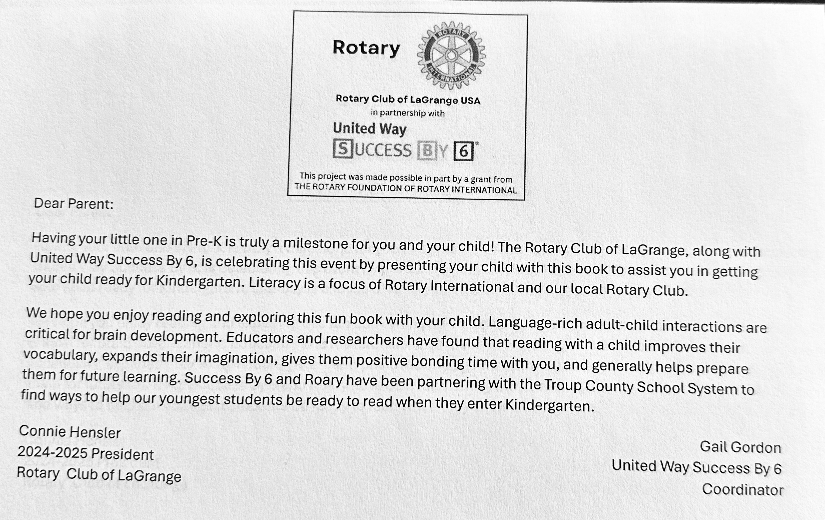 | District 6900's Grant, United Way and Success By 6 are our partners in this project. |