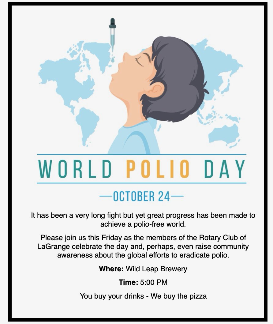 Each year LaGrange Rotary Club Members proudly participate in the Rotary International World Polio Day Program. This year World Polio Day was Friday, October 24. Again, we asked our members to make a small donation through one of three ways: by using Venmo, on their club statement or given directly at one of our regular club meetings. Donations were accepted until Wednesday, November 5th. The event was held at Wild Leap Brewery Two of the Rotary International polio presentations were planned to be shown during the event.